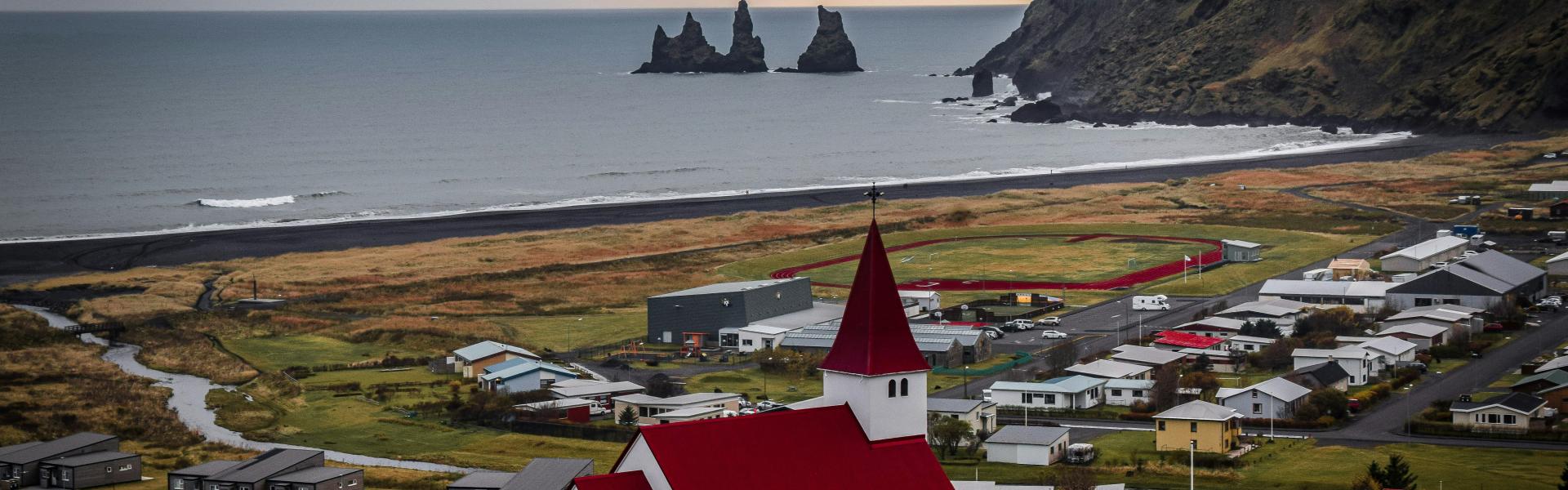 Das kleine Dorf Vík í Mýrdal liegt ganz am südlichen Rand von Island und zählt nur rund 300 Bewohner. Nicht weit entfernt schlummert der Vulkan Katla unter dem Gletscher Mýrdalsjökull. Ein echtes Highlight ist der Lavastrand Reynisfjara. Hier findest du schwarzen Sand, eine beeindruckende Brandung und wunderschöne Sonnenuntergänge. Von dort aus bietet sich dir ein freier Blick auf die bekannte Felsgruppe Reynisdrangar, die laut einer alten Legende versteinerten Trollen ähnelt. Im Zentrum von Vík erwarten dich gemütliche Cafés, Restaurants, kleine Läden und die Kirche mit ihrem auffälligen roten Dach.