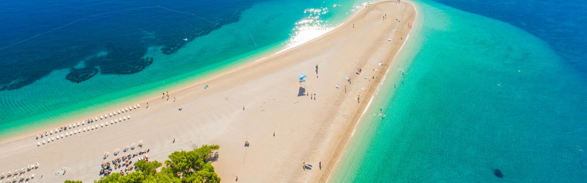 Der Kieselstrand Zlatni Rat liegt westlich von Bol auf der Insel Brač in Kroatien. Viele kennen diesen besonderen Strand wegen seiner markanten Form als das „Goldene Horn“. Gerade Familien mit Kindern fühlen sich hier wohl, weil das Ufer ganz flach ins Meer abfällt und die Kleinen entspannt im seichten Wasser planschen können. Von der Altstadt in Bol geht eine schöne Promenade direkt bis zum östlichen Teil von Zlatni Rat. Hier findest du Restaurants, Bars und einen lebhaften Markt mit bunten Ständen. Wer Lust auf Abwechslung hat, kommt bei den vielen Wassersportmöglichkeiten voll auf seine Kosten. Zlatni Rat gehört nicht ohne Grund zu den bekanntesten Stränden der Gegend.