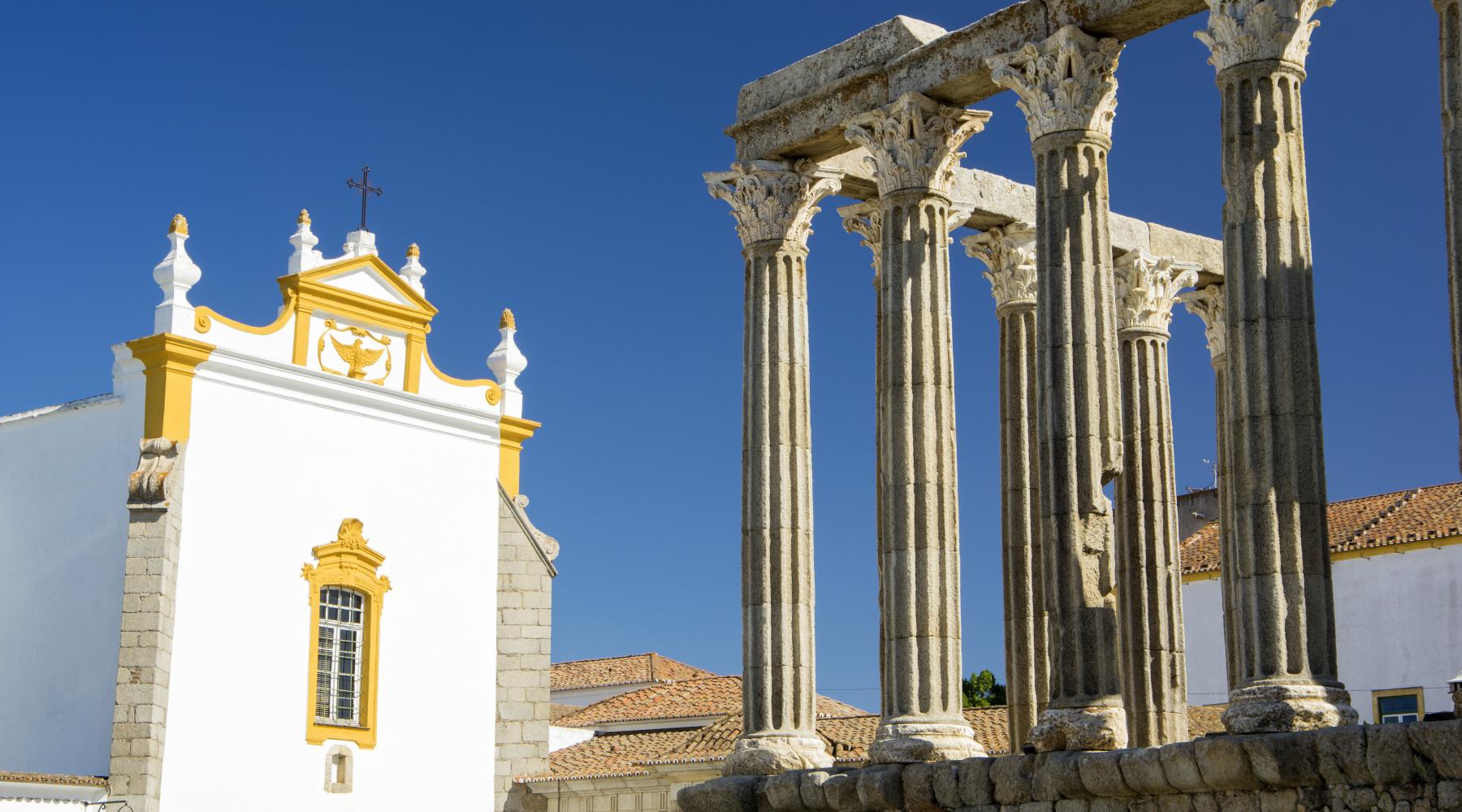 Évora liegt im Herzen des Alentejo und ist die größte Stadt dieser portugiesischen Region. Schon seit 1986 zählt die Altstadt zum UNESCO-Weltkulturerbe. Besonders spannend ist der römische Tempel, der als einziger seiner Art in ganz Portugal erhalten geblieben ist. Die Kathedrale aus dem 13. Jahrhundert beeindruckt mit ihrer Architektur, und die Capela dos Ossos ist etwas ganz Besonderes – hier sind die Wände mit den Knochen von mehr als 5.000 Menschen verziert. Mitten in der Stadt lockt der Praça do Giraldo. Hier findest du entspannte Cafés, kleine Läden und viele Restaurants, die zum Verweilen einladen. Rund um Évora gibt es noch mehr zu entdecken: Der Steinkreis Cromeleque dos Almendres ist einer der bekanntesten prähistorischen Orte Portugals, und das Dorf Arraiolos ist für seine kunstvollen Teppiche berühmt.
